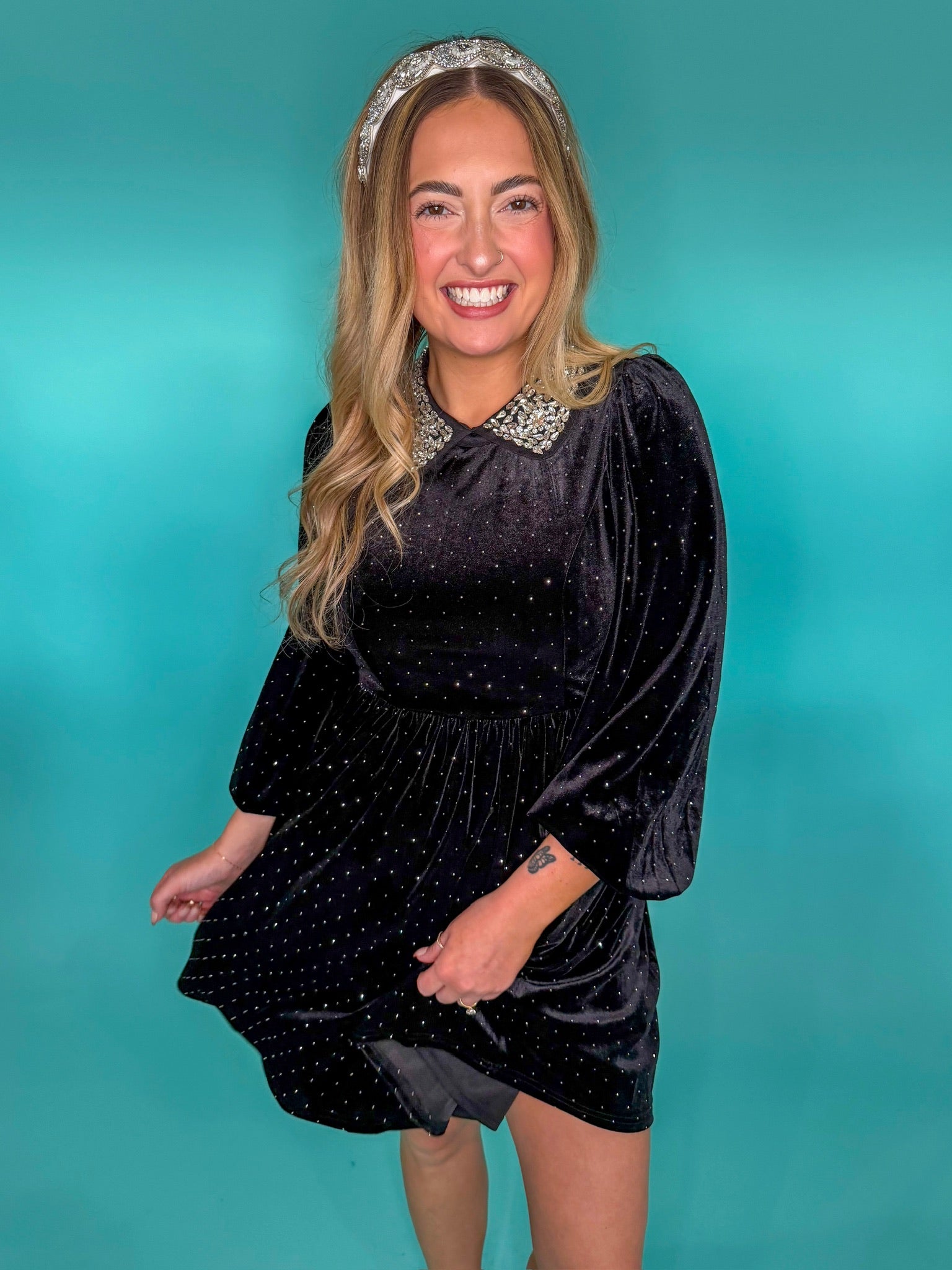 Add a little sparkle to your soirée with this playful yet polished dress. This velvet mini features all over polka dots, a glam rhinestone collar neckline, and long sleeves for a touch of vintage charm. Style it with platform heels and a jeweled headband for the ultimate party-ready look. - Velvet - Mini - Long sleeves - Zipper