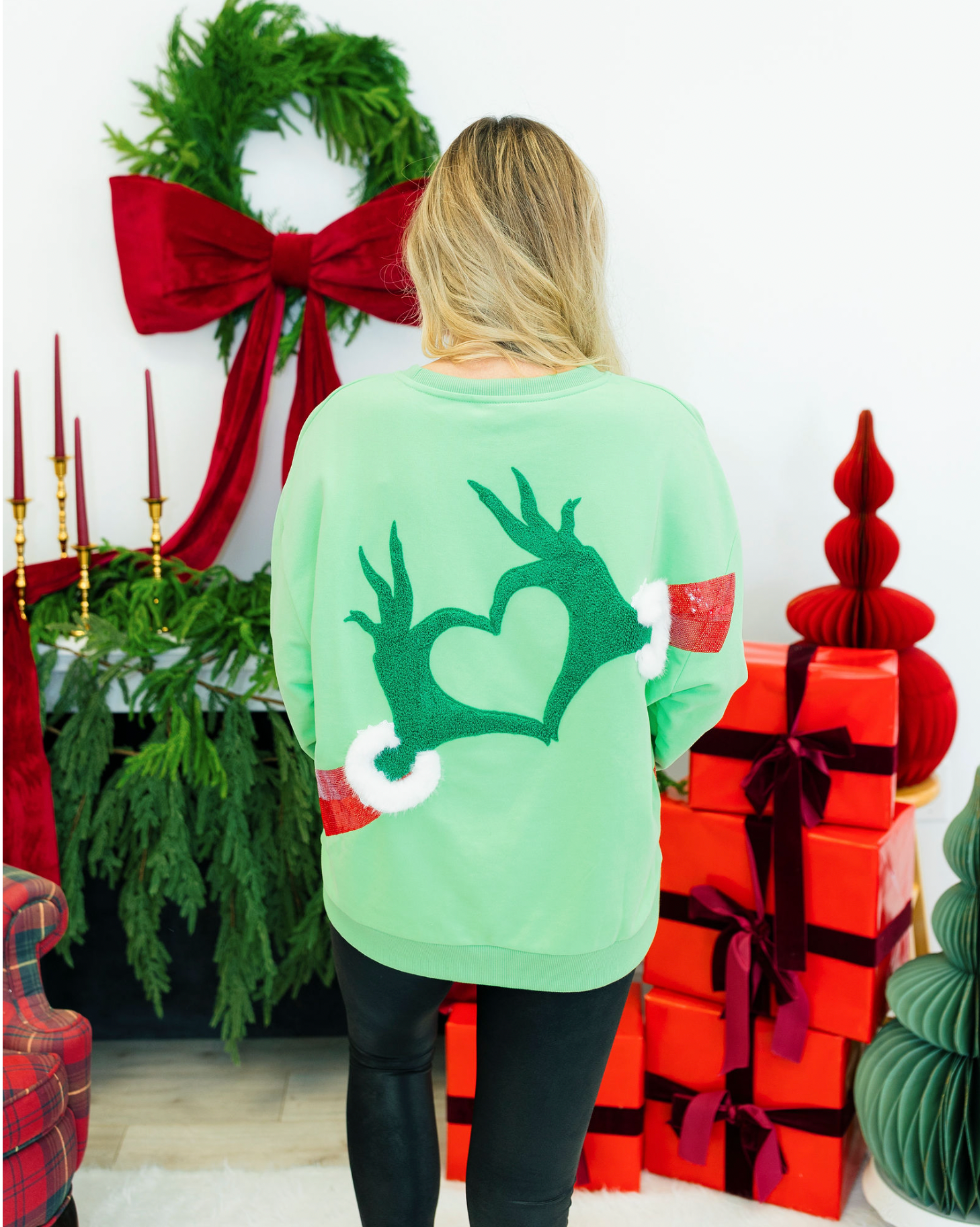 Queen of Sparkles Green Grinch Heart Hands Sweatshirt
